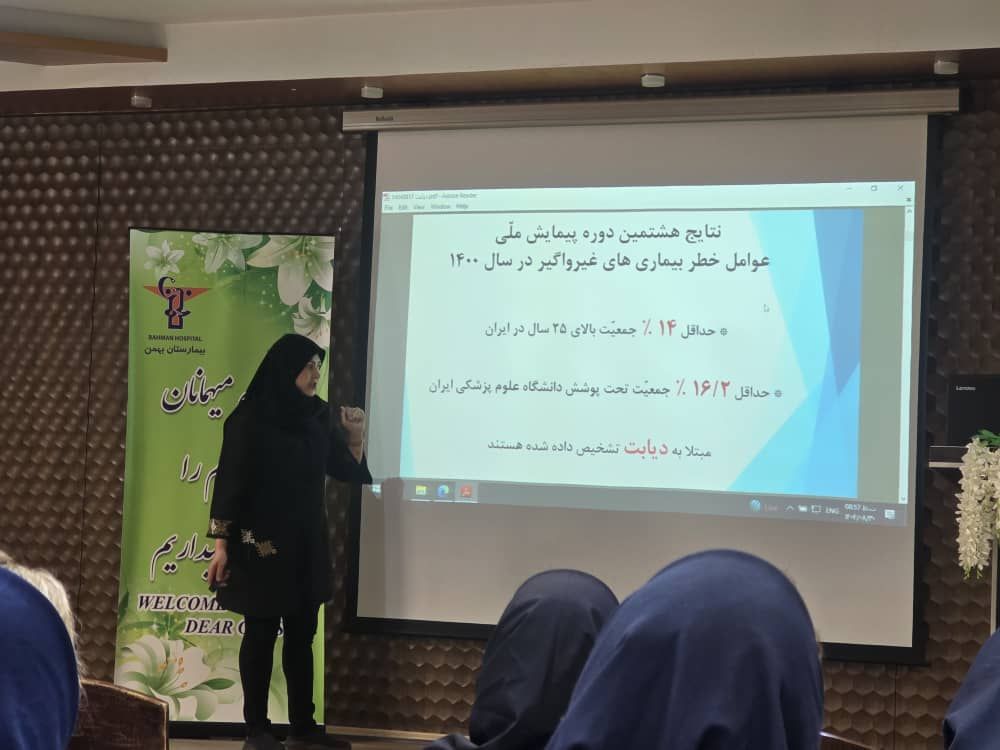 در ادامه این برنامهها، کلاس آموزشی دیابت با همکاری مرکز بهداشت شمال غرب تهران و با شعار روز جهانی دیابت «دیابت و محیط کار» در سالن همایش بیمارستان بهمن برگزار گردید. این دوره آموزشی با هدف افزایش آگاهی کارکنان، آشنایی با عوامل خطر، پیشگیری، مدیریت صحیح بیماری و نقش محیط کار در کنترل دیابت تشکیل شد.